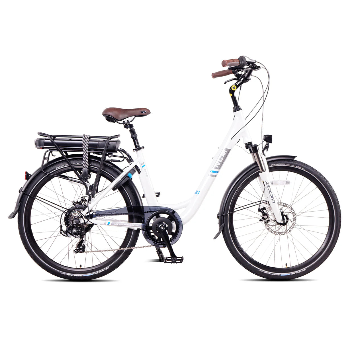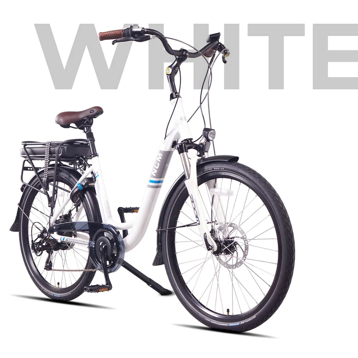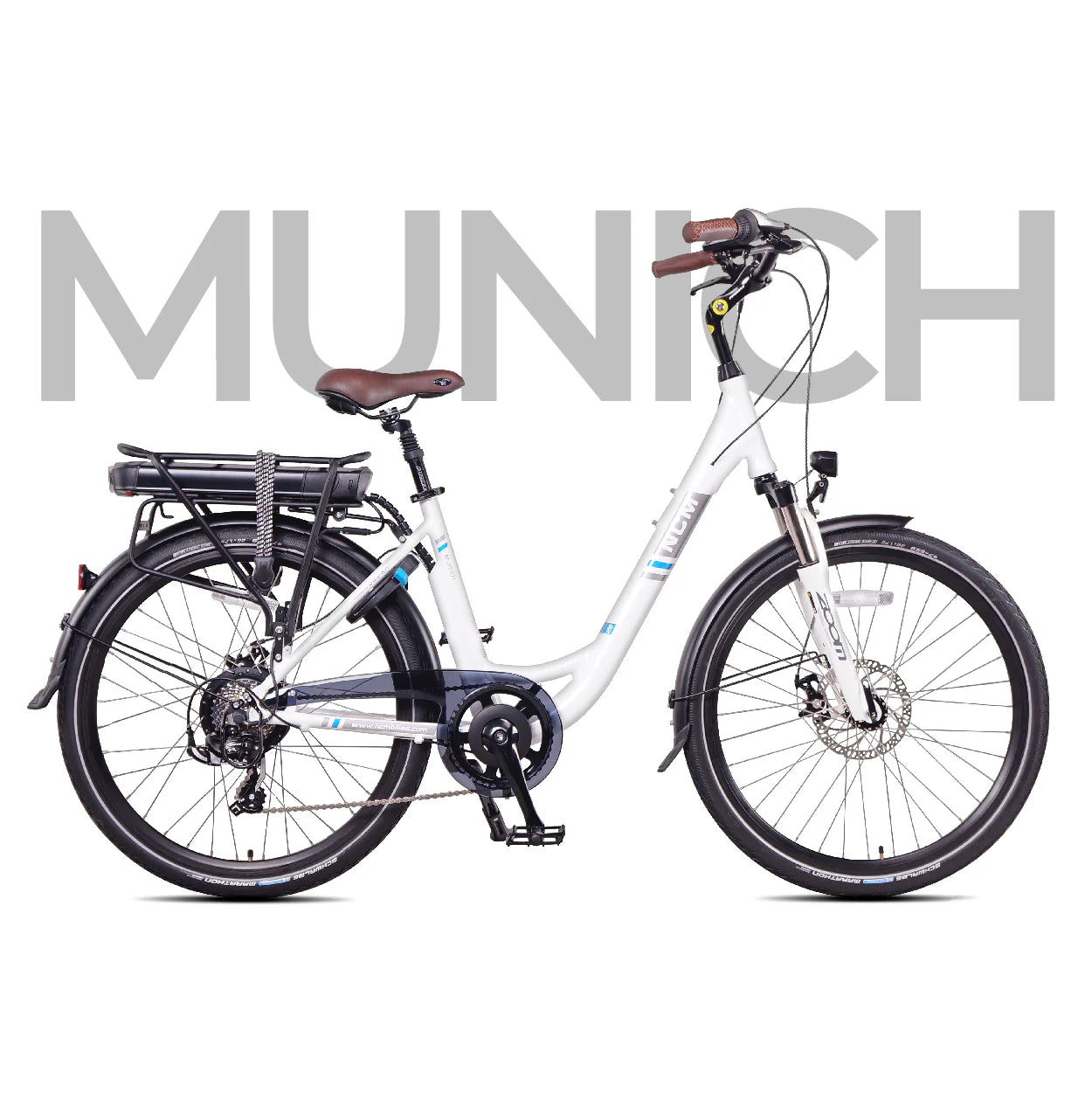 The NCM MUNICH is a step-through version based on our NCM Hamburg model. Mount and dismount with ease on the low-step design. The relatively light and sturdy aluminium alloy, the oversized frame comes in two sizes. The 36V battery and Das-Kit motor unite to power you through your daily commute or errand-running without the need to charge often. With a number of comfort and practicality features, such as seat post suspension, adjustable ergonomic riding position, a rear rack and built-in bike lock, the NCM Munich is an ideal selection as a daily travel companion.